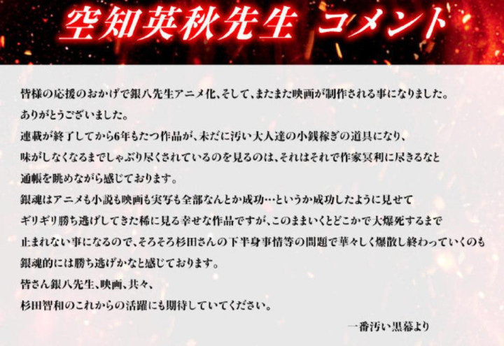 在《银魂》最新戏院版的音问发布之后,原著述者亦然发表了我方对戏院版的一些主见,对戏院版进行了吐槽。