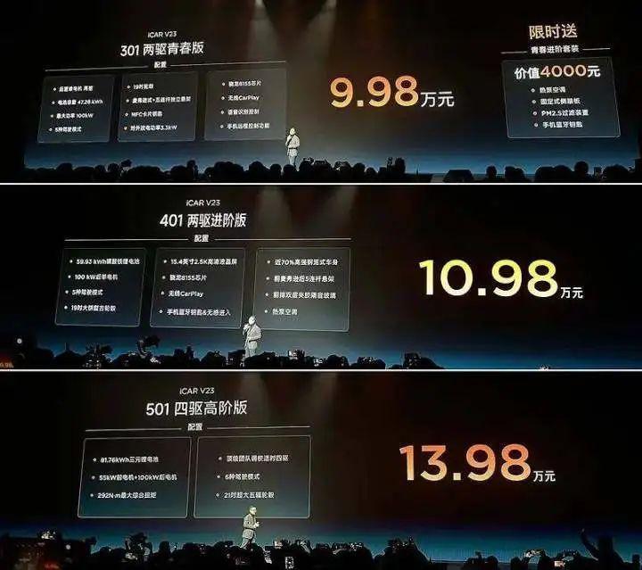 领先价钱方面,iCAR V23预售价为11万—15万元,预售时晓喻只好续航401公里两驱和续航501公里的四驱两个版块,但厚爱上市这两个版块的价钱阔别为10.98万元和13.98万元,且不含科技选装包。而新公布的续航301公里两驱版,诚然售价只好9.98万元,但并非主销车型,且续航短、2025年3月才智请托。如斯居品订价,让一些花费者感受到了“忠诚不及”。