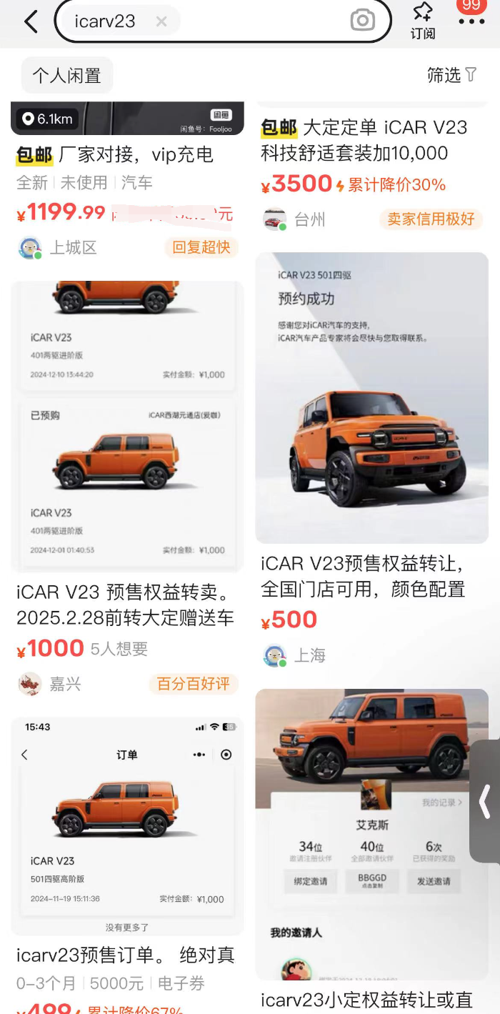 橙柿互动电车志记者查阅某二手交游网站后发现,如实有多位用户在转卖iCAR V23的订单。