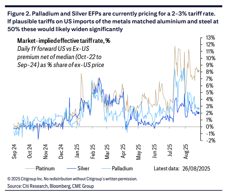 花旗继续团队示意,现时白银和钯金的交往所期货溢价(EFP)仅为2-3%,赫然低估了好意思国关税风险。