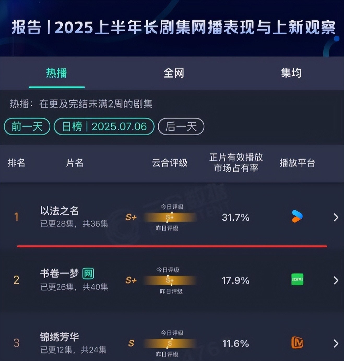 从2025年上半年剧集播放量统计,咱们可以发现,古装剧更容易赢得网友们的深爱,《藏海传》《大奉击柝东说念主》《低头》《国色青春》等剧都取得可以的收货,但在6月份,却出现一部“黑马剧”,这部剧即是《以法之名》。