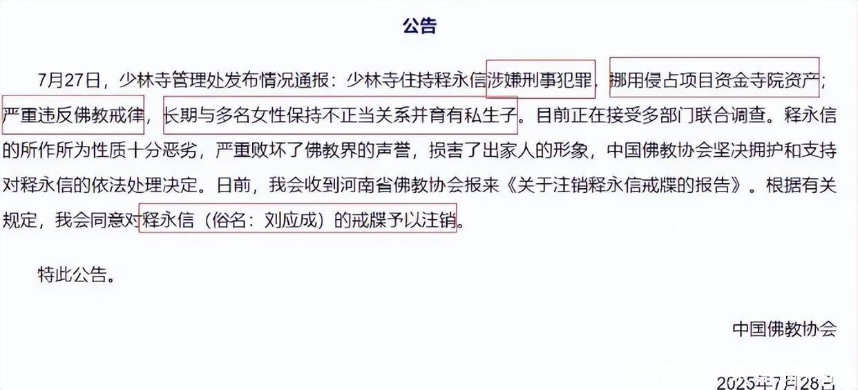中国释教协会一纸公告,宣告了释永信宗教生计的闭幕。2025年7月28日,协会依据《汉传释教教职东说念主员履历认定方针》,崇拜刊出其戒牒。这张象征僧东说念主身份的“宗教身份证”作废,意味着他被历久逐出空门。