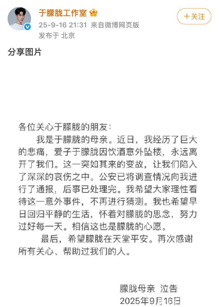 9月16日晚,于蒙胧母亲通过于蒙胧责任室官方帐号发表声明,向巨大网友阐述于蒙胧死因为酒后有时坠楼。