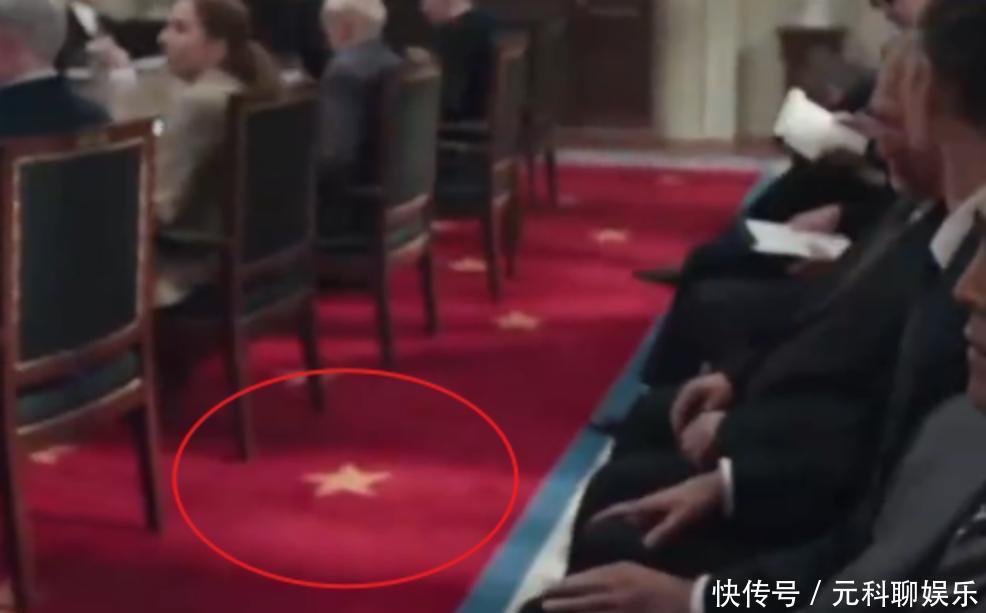 这还仅仅其中一个场所,另外皮剧中有这样一段在白宫开展会议的视频,大地上铺的恰是红毯,并且还印有黄色五角星,这难谈不是特意的吗?为什么不成以遴荐其他图案和情态搭配,比如白色底加上红色太阳,大致是彩色条纹?