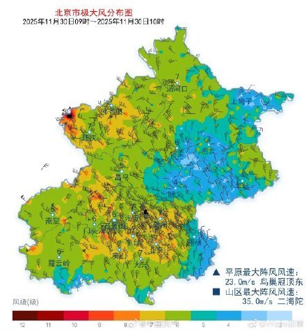 北京北风增强,今天9-10时城区瞬时大风7-8级(鸟巢23米/秒,9级、二海陀35米/秒,12级)。@中国天气 首席征象分析师胡啸暗意,当天午后北风最强。明日风力减轻,12月2日补充冷空气南下,北风再增强。
