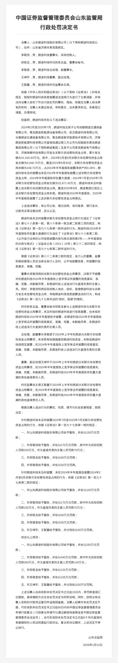 对此,山东证监局决定对山东朗进科技股份有限公司予以告诫欧洲杯体育,并处以250万元罚金;对李敬茂予以告诫,并处以440万元罚金;对邱若龙予以告诫,并处以120万元罚金;对李敬恩予以告诫,并处以105万元罚金;对王绅宇、王智鑫予以告诫,并鉴识处以50万元罚金。