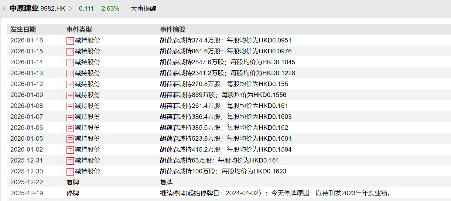 不外,值得肃穆的是,在华夏建业收复来回的一个多月来,胡葆森却进行屡次减持。期间周报记者查询港交所公告获悉,2025年12月30日至2026年1月16日,胡葆森共计减持13次,揣摸减持超9700万股,占公司总股本的2.51%,套现超1000万港元。